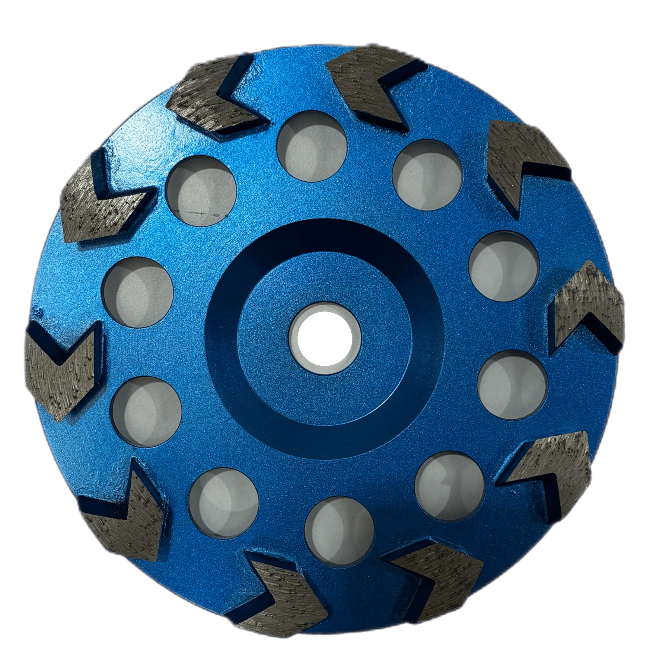 The 180mm Blue Diamond Cup Wheel with 10 low-profile arrow-shaped segments in 40/50 grit is designed for efficient material removal and controlled semi-aggressive grinding. The arrow segment shape promotes fast cutting and good debris clearance, while the low-profile design helps keep the wheel stable and predictable on the slab. Built to suit removal work and general concrete prep, this cup wheel performs well on medium to harder concrete where a balance of speed and control is required.